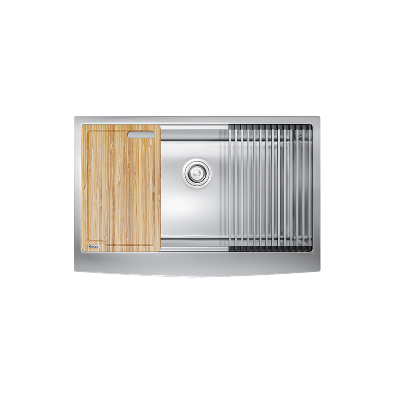 - Thiết kế hiện đại với gờ hạ bậc – tích hợp phụ kiện thông minh: Siphon, giá úp bát inox, chậu rửa nhỏ, thớt inox, thớt inox lỗ